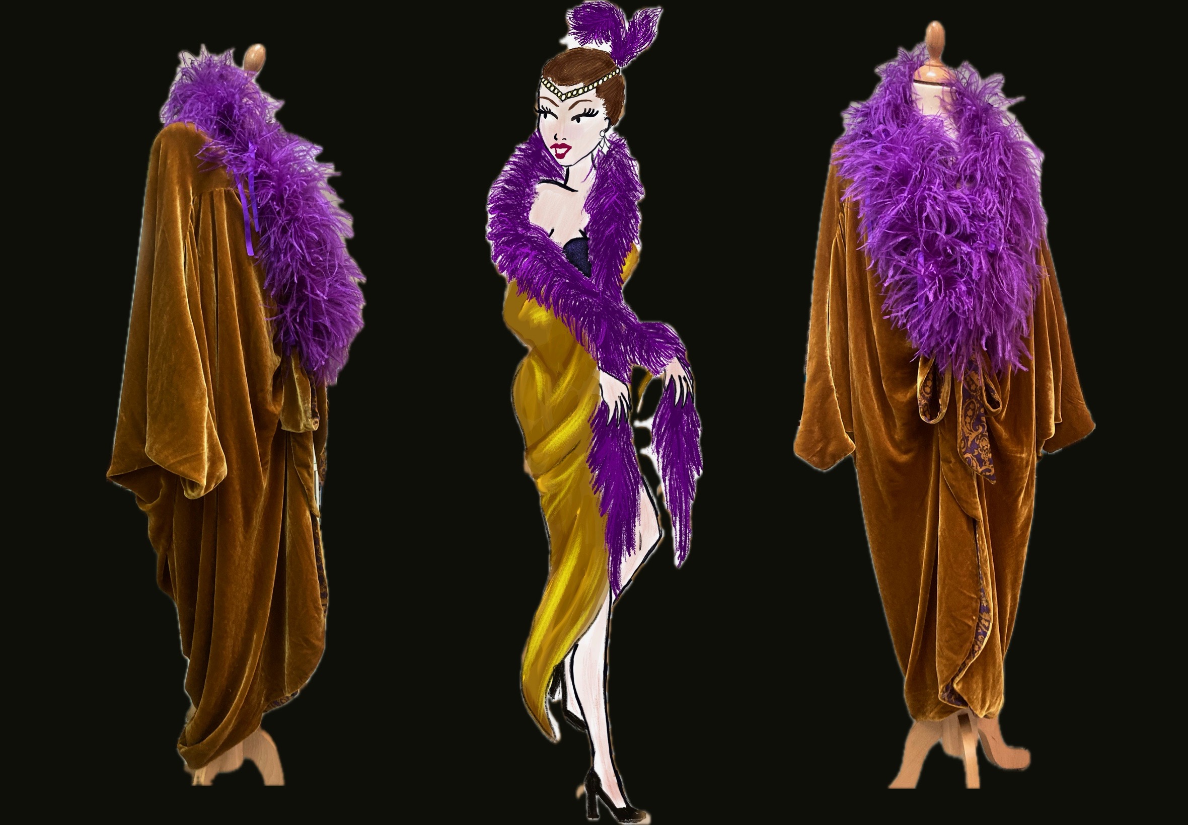 les plumes, le galon et les strass sont cousus à la main.